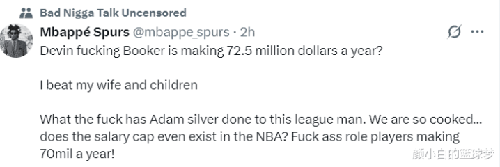 球迷:布克每一年可以赚7250万美元?亚当-萧华一手推动这个联盟改革,我们完蛋了,这个联盟还有工资帽吗?那些年薪超过7000万的球星根本是在浪费资源。