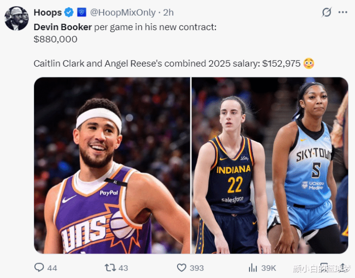 美媒:布克这份新合同打一场比赛拿88万美元,可WNBA球星克拉克+里斯今年的薪水合计才15万美元。
