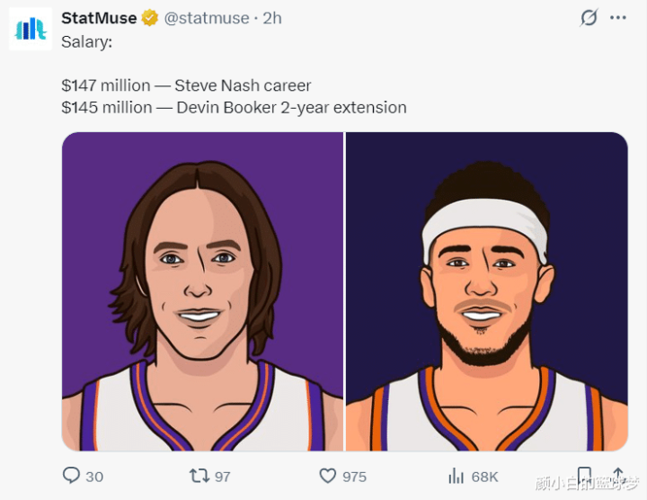 美媒:纳什整个职业生涯才赚1.47亿,而布克两年合同就要赚1.47亿