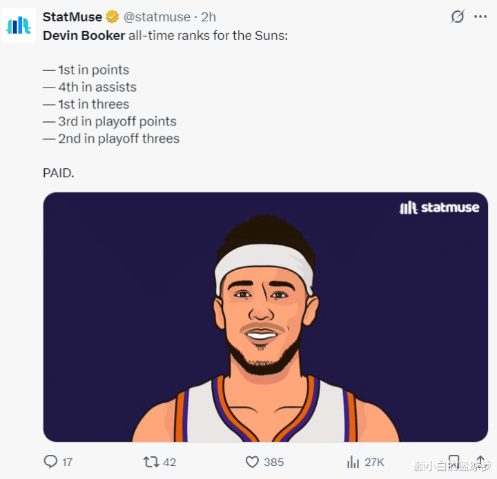 太阳给布克这份顶薪也不无道理,他们依旧将布克视为球队的核心,布克是太阳队史得分王、助攻榜第四、三分球、季后赛得分第三、季后赛三分第二。