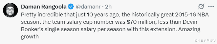 美记:15-16赛季联盟的工资帽才7000万美元,如今布克一年就要拿7000万,这实在是令人难以置信,联盟工资帽的增长太快。